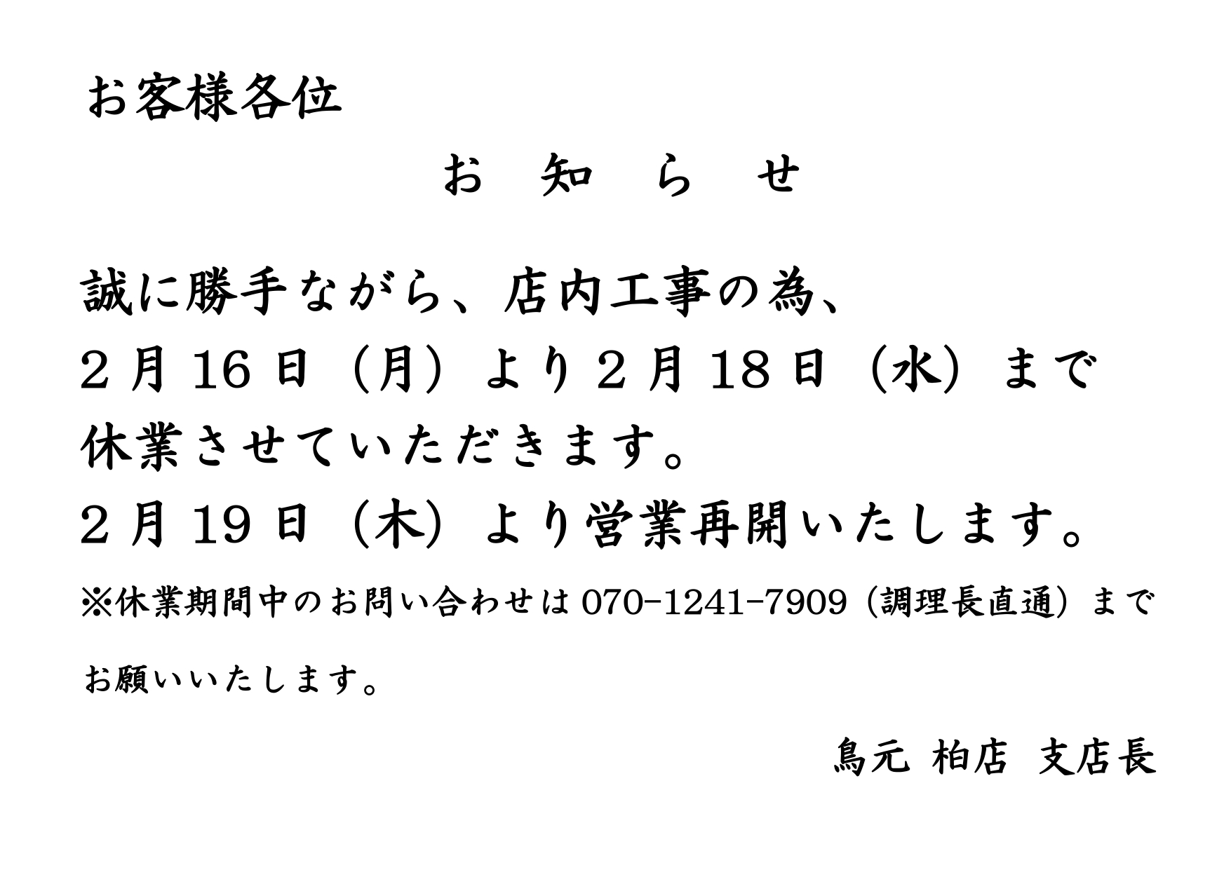 【鳥元 柏店】臨時休業のお知らせ